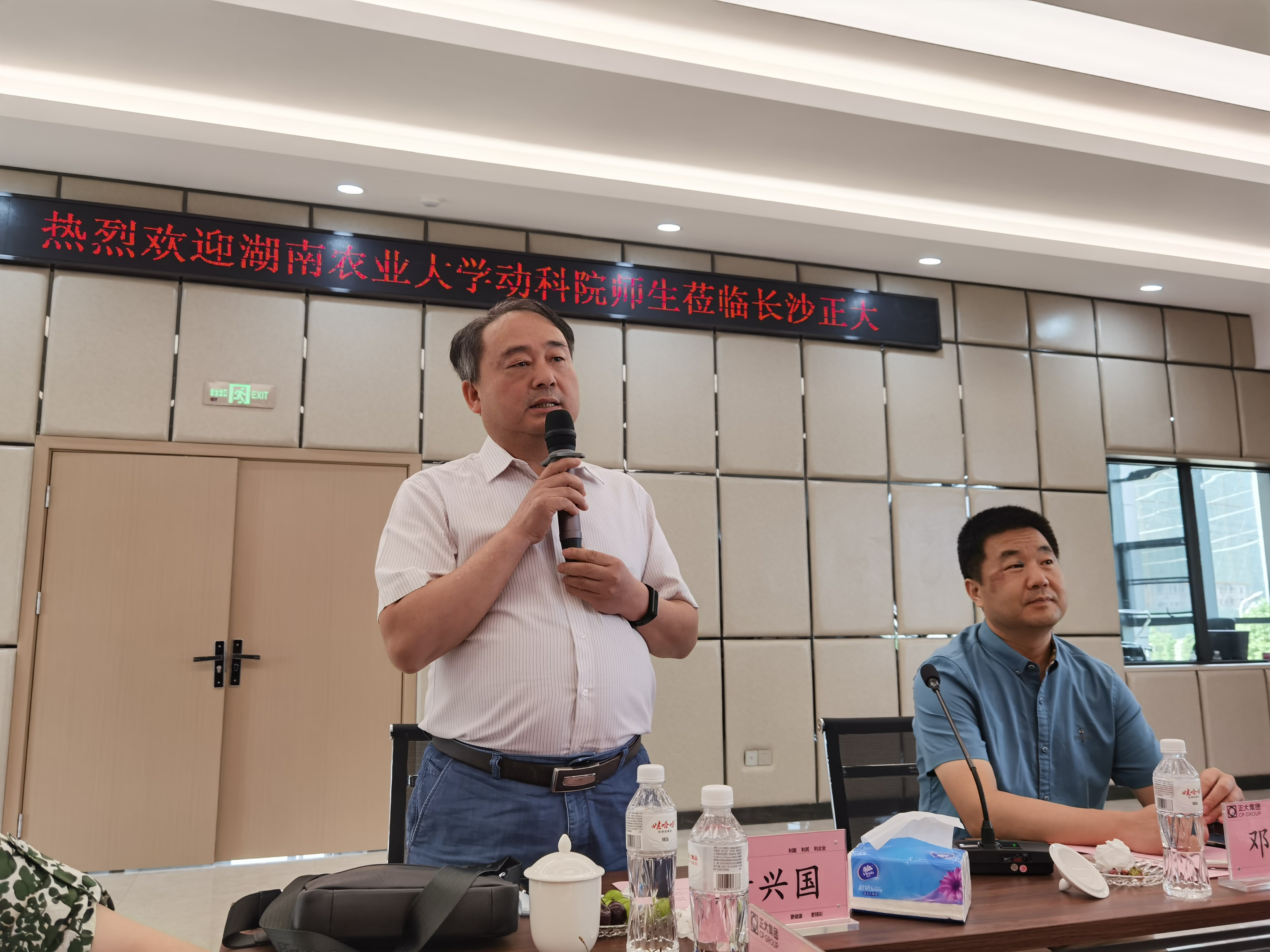 参观结束后,动科院师生立刻马不停蹄前往湖南普菲克公司,在公司食堂进行了交流会。首先由潘长咏董事长致辞,他热烈欢迎了动科院全体师生的到来,并分享了他个人的经历以及与我校的渊源。动科院黄兴国教授提出,企业的发展离不开人才,人才的挖掘离不开企业,企业与人才是一个“你中有我,我中有你”的关系,希望学校能够成为企业和学生之间的一道桥梁,在未来的交流中实现合作共赢。随后,李静经理作企业介绍,生产及产品讲解。为让同学们更直观地感受到生产线的作业,公司特安排工作人员带同学们参观生产发酵、包被等生产线,更是准备了学生提问、交流环节,极大程度上解决了同学们参观途中遇到的问题。在普菲克公司的招待下,全体师生用了午饭后乘车返回学校。
