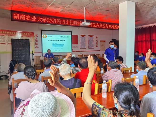 会后,“博士团”全体师生、政府部门负责人、云鹤村养殖户又紧锣密鼓地开展了相关的专业座谈会及养殖培训会,“博士团”指导老师方热军教授,就如何选择合适的牛羊品种、牛羊的消化特征、如何给牛羊提供合适的营养、牛羊饲料配制新技术四个方面,给出了专业的建议。桑植县“三区”人才张佩华教授,根据一路走访而来的细微观察,与村民们亲切互动,深入了解到养殖户生产过程中的实际问题,并进行现场问答。