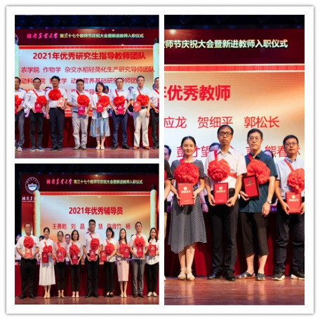 9月10日,学校召开了“庚续百年初心,担当育人使命”为主题的教师节庆祝大会暨新进教师入职仪式,大会表彰了湖南省2021年教书育人楷模、湖南省首届最美辅导员,学校2021年度优秀教师、优秀教育工作者、青年教学标兵、优秀辅导员、优秀研究生指导教师和团队。永利官网高志鹏老师作为青年教学标兵、郭松长老师作为优秀教师、杨雄老师作为优秀辅导员和贺建华教授领衔的动物营养基础研究团队作为优秀研究生指导团队受到表彰,高志鹏老师作为获奖代表在大会发言。