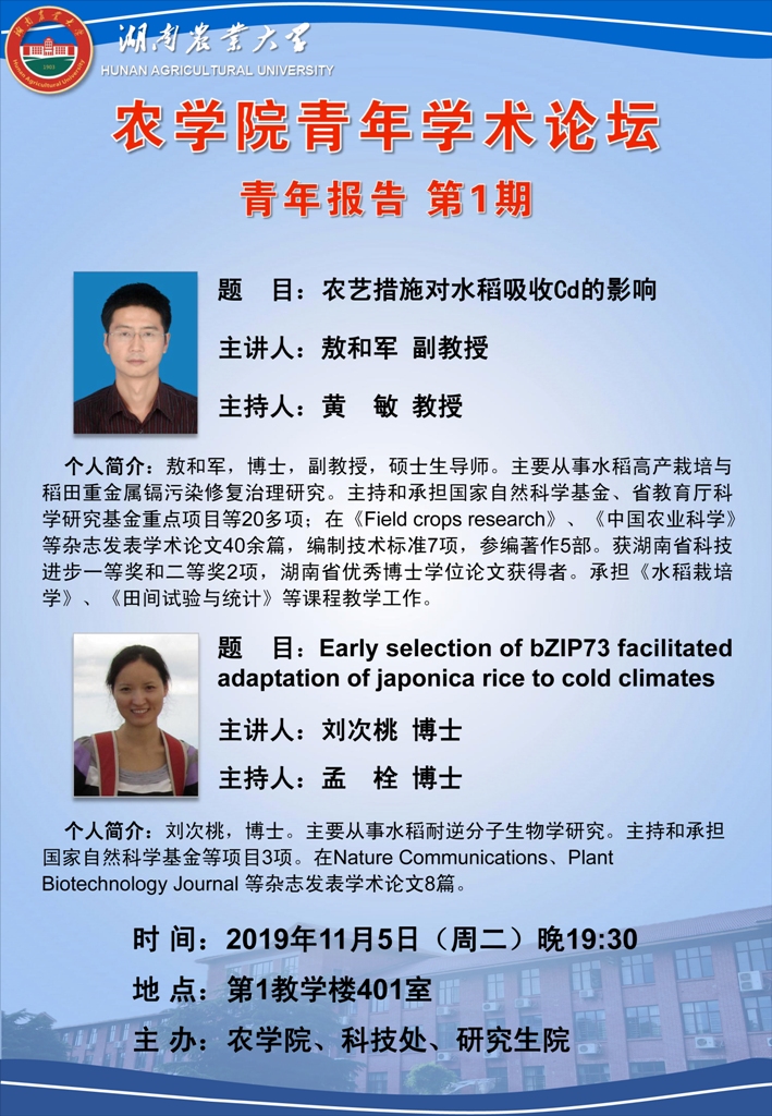 永利集团3044官网欢迎您农学院青年学术论坛(青年报告 第1期)——农艺措施对水稻吸收Cd的影响/Early selection of bZIP73 facilitated adaptation of japonica rice to cold climates